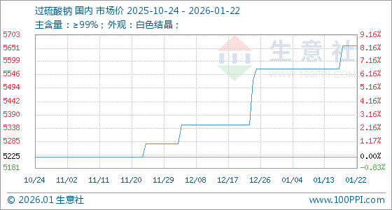 1月22日,生意社过硫酸钠基准价为5660.00元/吨,与本月初(5570.00元/吨)相比,上涨了1.62%。