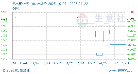 1月22日,生意社无水氯化钙基准价为1040.00元/吨,与本月初(1025.00元/吨)相比,上涨了1.46%。