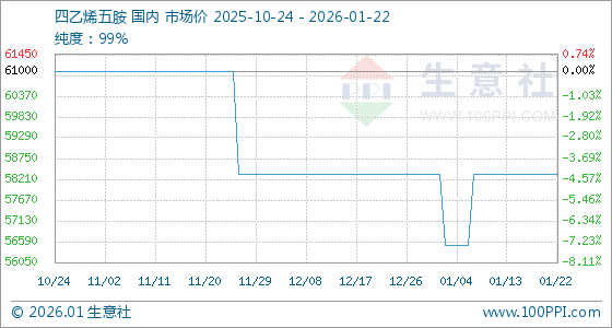 1月22日,生意社四乙烯五胺基准价为58333.33元/吨,与本月初持平。