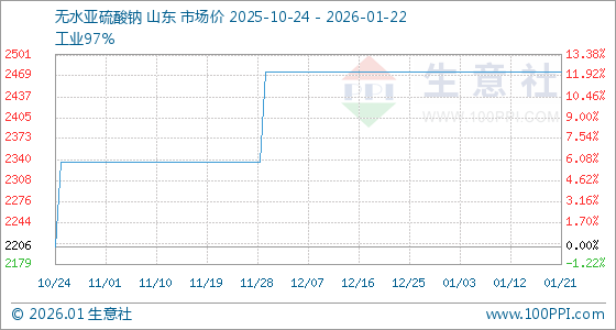 1月22日,生意社无水亚硫酸钠基准价为2475.00元/吨,与本月初持平。