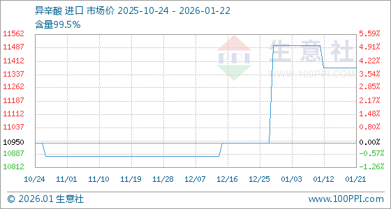 1月22日,生意社异辛酸基准价为11375.00元/吨,与本月初(11500.00元/吨)相比,下降了1.09%。