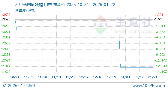 1月22日,生意社2-甲基四氢呋喃基准价为11780.00元/吨,与本月初持平。