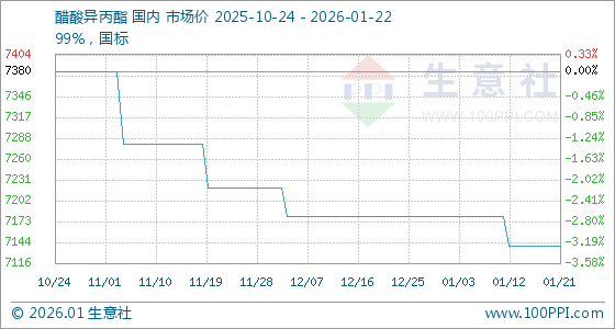 1月22日,生意社醋酸异丙酯基准价为7140.00元/吨,与本月初(7180.00元/吨)相比,下降了0.56%。