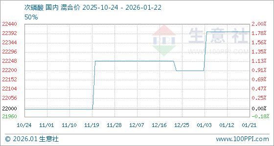 1月22日,生意社次磷酸基准价为22400.00元/吨,与本月初(22200.00元/吨)相比,上涨了0.90%。