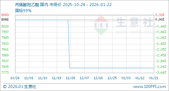 1月22日,生意社丙烯酸羟乙酯基准价为7800.00元/吨,与本月初持平。