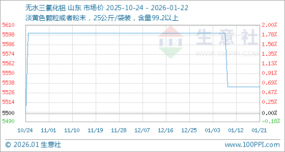 1月22日,生意社无水三氯化铝基准价为5533.33元/吨,与本月初(5600.00元/吨)相比,下降了1.19%。
