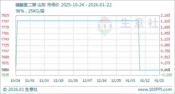 1月22日,生意社磷酸氢二钾基准价为7650.00元/吨,与本月初(7800.00元/吨)相比,下降了1.92%。