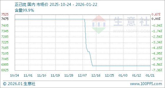 1月22日,生意社正己烷基准价为6975.00元/吨,与本月初持平。
