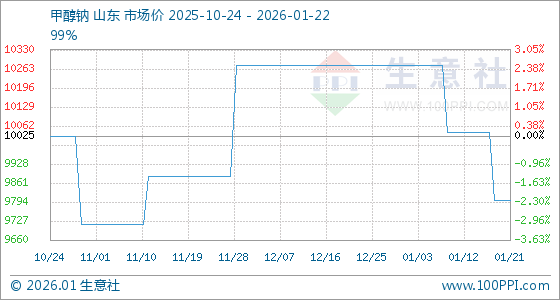 1月22日,生意社甲醇钠基准价为9800.00元/吨,与本月初(10275.00元/吨)相比,下降了4.62%。