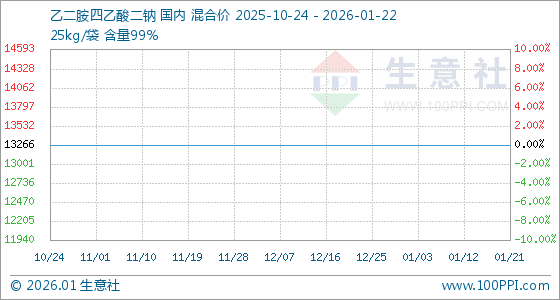1月22日,生意社乙二胺四乙酸二钠基准价为13266.67元/吨,与本月初持平。