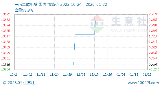 1月22日,生意社三丙二醇甲醚基准价为13640.00元/吨,与本月初持平。