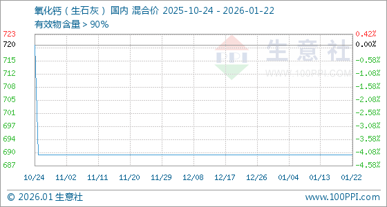 1月22日,生意社氧化钙(生石灰)基准价为690.00元/吨,与本月初持平。