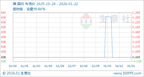 1月22日,生意社碘基准价为638.33元/千克,与本月初持平。