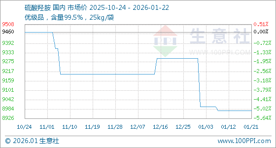 1月22日,生意社硫酸羟胺基准价为8975.00元/吨,与本月初(9300.00元/吨)相比,下降了3.49%。