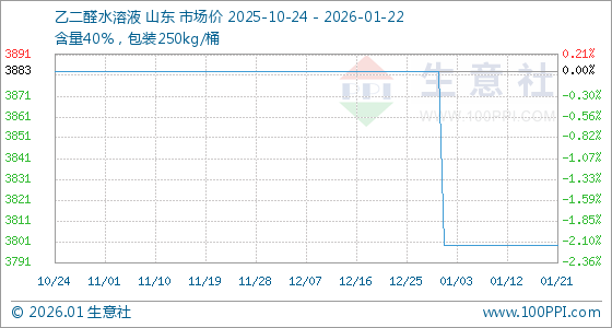 1月22日,生意社乙二醛水溶液基准价为3800.00元/吨,与本月初(3883.33元/吨)相比,下降了2.15%。