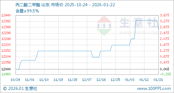 1月22日,生意社丙二酸二甲酯基准价为12325.00元/吨,与本月初(12200.00元/吨)相比,上涨了1.02%。