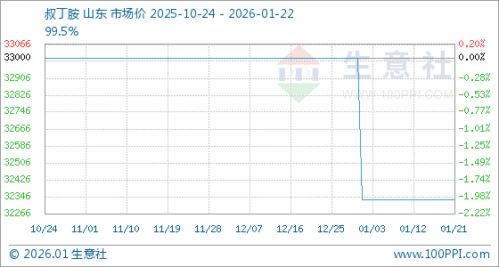 1月22日,生意社叔丁胺基准价为32333.33元/吨,与本月初(33000.00元/吨)相比,下降了2.02%。