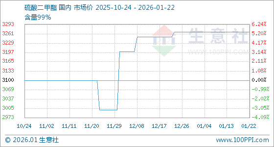 1月22日,生意社硫酸二甲酯基准价为3266.67元/吨,与本月初持平。