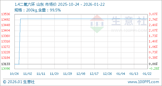 1月22日,生意社1.4二氧六环基准价为13500.00元/吨,与本月初持平。