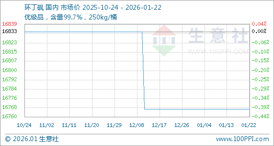 1月22日,生意社环丁砜基准价为16766.67元/吨,与本月初持平。