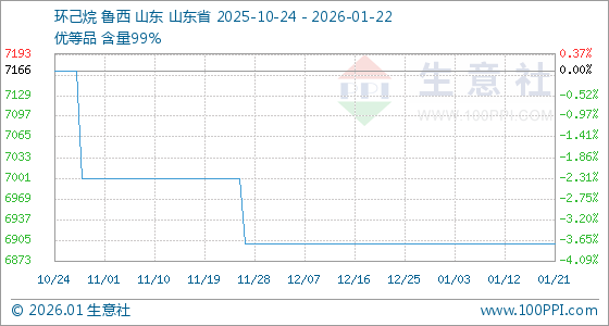 1月22日,生意社环己烷基准价为6900.00元/吨,与本月初持平。