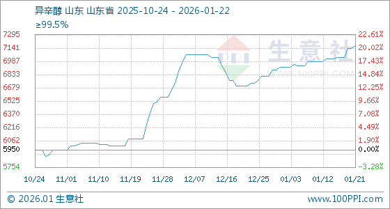 1月22日,生意社异辛醇基准价为7166.67元/吨,与本月初(6916.67元/吨)相比,上涨了3.61%。