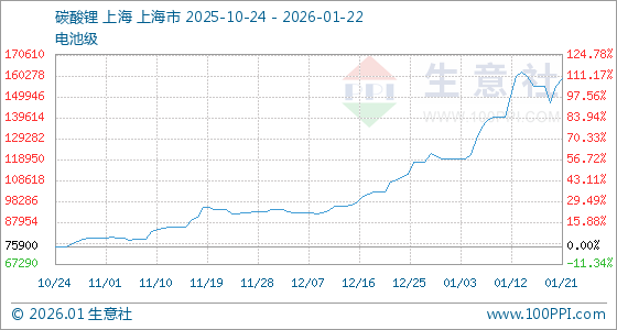 1月22日,生意社碳酸锂(电池级)基准价为159000.00元/吨,与本月初(119400.00元/吨)相比,上涨了33.17%。