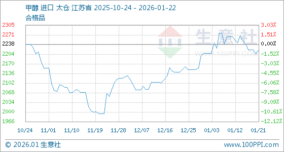 1月22日,生意社甲醇基准价为2218.33元/吨,与本月初(2207.50元/吨)相比,上涨了0.49%。
