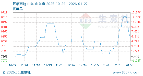 1月22日,生意社环氧丙烷基准价为8133.33元/吨,与本月初(7733.33元/吨)相比,上涨了5.17%。