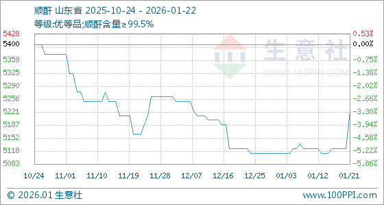 1月22日,生意社顺酐基准价为5225.00元/吨,与本月初(5112.50元/吨)相比,上涨了2.20%。