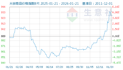 1月21日大宗商品价格指数BPI为930点, 较昨日上升了1点 , 较周期内最高点1343点(2021-10-19)下降了30.75%,较2016年02月03日最低点660点上涨了40.91%。
