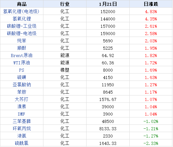 据生意社价格监测,2026年1月21日大宗商品价格涨跌榜中环比上升的商品共48种,集中在化工板块(共28种)和橡塑板块(共4种),涨幅前3的商品分别为氢氧化锂(电池级)(4.83%)、氢氧化锂(4.35%)、碳酸锂-工业级(2.61%)。 环比下降的商品共43种,集中在化工(共14种)和橡塑(共6种),跌幅前3的商品分别为硫酰氯 (-2.33%)、液氨(-1.27%)、环氧丙烷(-1.21%)。