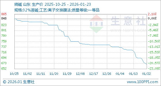 1月23日,生意社烧碱基准价为670.00元/吨,与本月初(738.00元/吨)相比,下降了9.21%。
