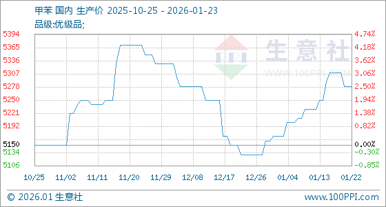 1月23日,生意社甲苯基准价为5280.00元/吨,与本月初(5170.00元/吨)相比,上涨了2.13%。