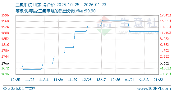1月23日,生意社三氯甲烷基准价为1900.00元/吨,与本月初(1966.67元/吨)相比,下降了3.39%。
