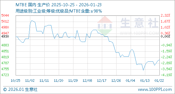 1月23日,生意社MTBE基准价为4806.67元/吨,与本月初(4823.33元/吨)相比,下降了0.35%。