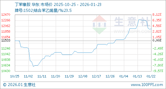 1月23日,生意社丁苯橡胶基准价为11958.33元/吨,与本月初(11575.00元/吨)相比,上涨了3.31%。