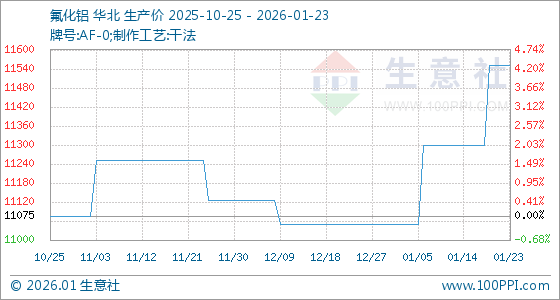 1月23日,生意社氟化铝基准价为11550.00元/吨,与本月初(11050.00元/吨)相比,上涨了4.52%。