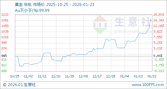 1月23日,生意社黄金基准价为1077.02元/克,与本月初(977.07元/克)相比,上涨了10.23%。