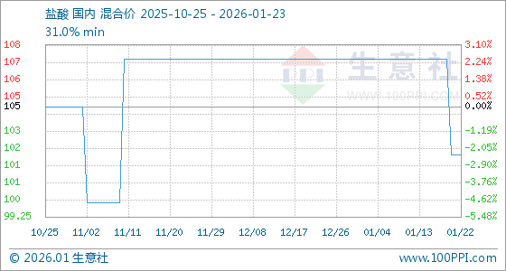 1月23日,生意社盐酸基准价为102.50元/吨,与本月初(107.50元/吨)相比,下降了4.65%。