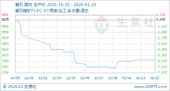 1月23日,生意社萤石基准价为3406.25元/吨,与本月初(3400.00元/吨)相比,上涨了0.18%。