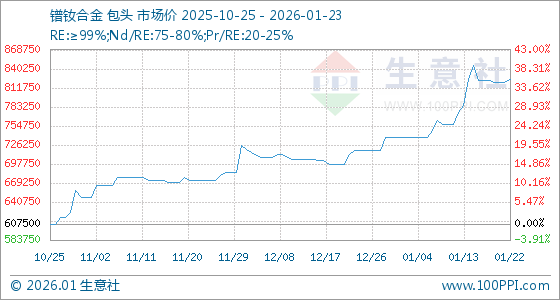 1月23日,生意社镨钕合金基准价为825000.00元/吨,与本月初(737500.00元/吨)相比,上涨了11.86%。