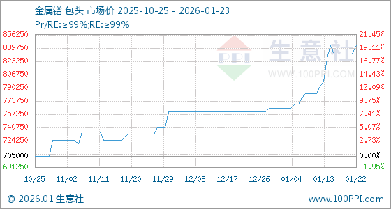 1月23日,生意社金属镨基准价为842500.00元/吨,与本月初(765000.00元/吨)相比,上涨了10.13%。