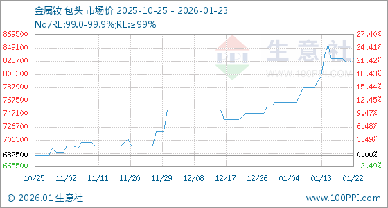 1月23日,生意社金属钕基准价为832500.00元/吨,与本月初(765000.00元/吨)相比,上涨了8.82%。