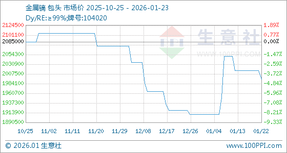 1月23日,生意社金属镝基准价为1995000.00元/吨,与本月初(1910000.00元/吨)相比,上涨了4.45%。