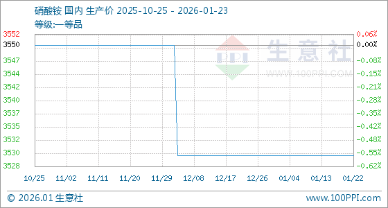 1月23日,生意社硝酸铵基准价为3530.00元/吨,与本月初持平。