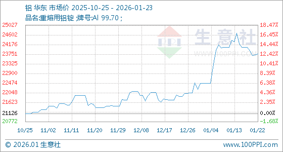 1月23日,生意社铝基准价为23753.33元/吨,与本月初(22473.33元/吨)相比,上涨了5.70%。