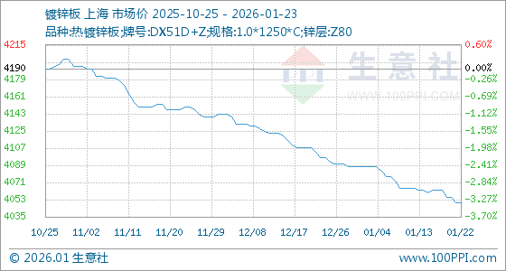 1月23日,生意社镀锌板基准价为4050.00元/吨,与本月初(4087.50元/吨)相比,下降了0.92%。