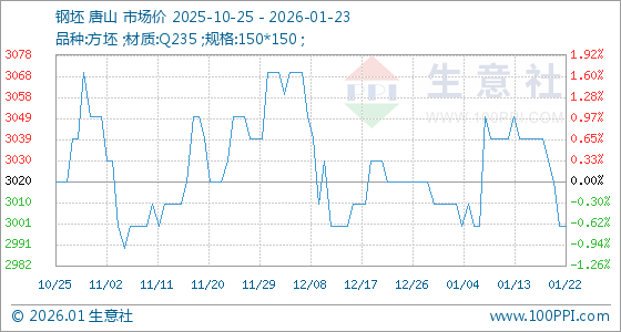 1月23日,生意社钢坯基准价为3000.00元/吨,与本月初(3010.00元/吨)相比,下降了0.33%。