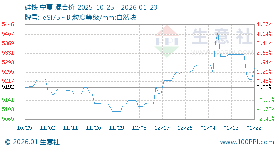 1月23日,生意社硅铁基准价为5271.43元/吨,与本月初(5285.71元/吨)相比,下降了0.27%。